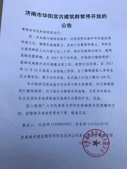11月22日,因华阳宫古建筑群部分设施陈旧老化,建构筑物急需修缮,即日起进入全面施工修复阶段。ok138cn太阳集团古天乐华阳宫及华山风景区建设管理项目部发布济南市华阳宫古建筑群暂停开放的公告。