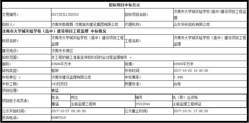 济南市大学城实验学校(高中)建设项目工程监理中标公示