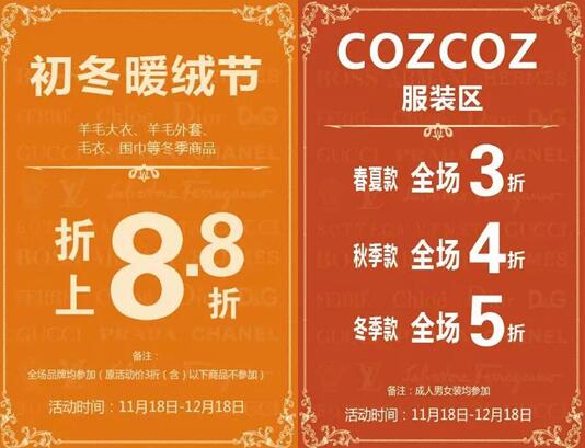 11月18日—12月18日推出“初冬暖绒节”活动,羊毛大衣、羊毛外套、毛衣、围巾等冬季商品折上8.8折优惠,cozcoz服装区3~5折优惠进行中。