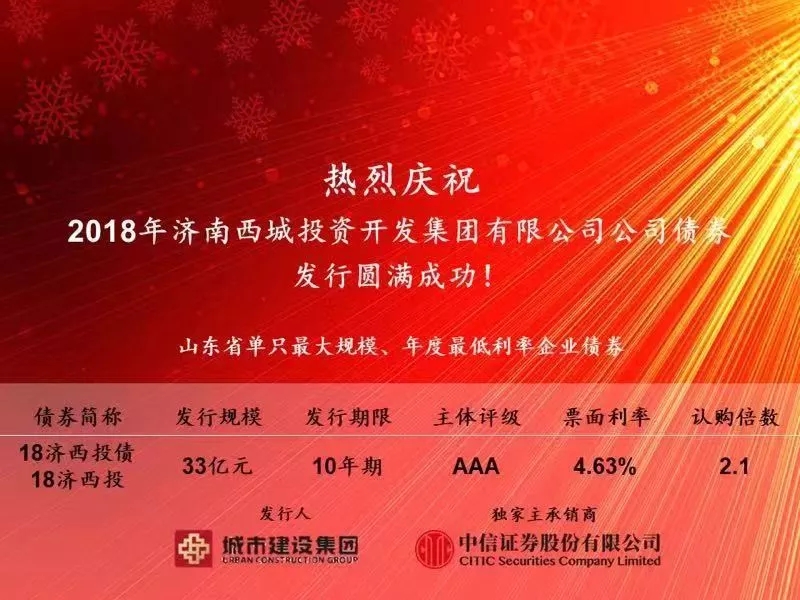 12月14日,ok138cn太阳集团古天乐全资子公司济南西城投资开发集团有限公司成功发行33亿元企业债券,共有53家机构参与认购,认购倍数2.1倍,认购总额达到70亿元,发行利率4.63%,期限10年。该笔企业债券创下多项省市企业债券发行之最,是我省2018年规模最大、本年度利率最低的企业债券,同时该笔债券融资也是济南市有史以来获批最大规模、今年唯一一笔企业债券。