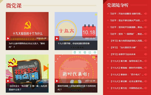 《十九大报告的十个为什么》、《社会主义有点潮》、《给90后讲讲马克思》、《马克思是对的》、《我是共产党员》……“云党课”学习平台目前重点收录了十九大精神系列解读、最新最潮的系列微视频、以及我党十八大以来的党建工作、治国理政等相关党课学习视频课程共计200余部,涵盖党建、政治、经济、文化、社会、外交等各个领域。平台主要分为三大板块:微党课、党课随身听、党报天天读,兼容PC端与手机端,方便广大党员干部及群众多视角、多形式学习党课内容。