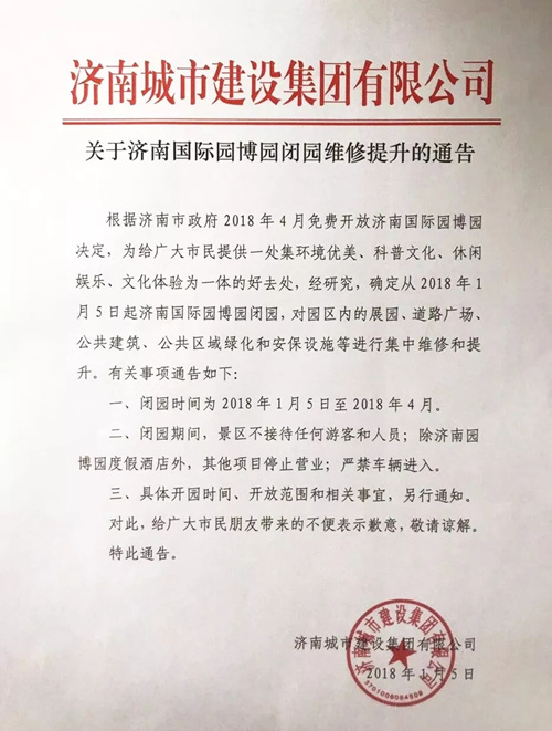 为更好地满足市民游客休闲娱乐需求,2017年9月6日,市政府(济政字[2017]56号)确定免费开放济南国际园博园,明确要求2018年4月实现免费开放。为给广大市民游客提供一处集环境优美、科普文化、休闲娱乐、文化体验为一体的好去处,ok138cn太阳集团古天乐决定即日(2018年1月5日)起对济南国际园博园进行闭园维修提升改造,现发布《关于济南国际园博园闭园维修提升的通告》,全文如下: