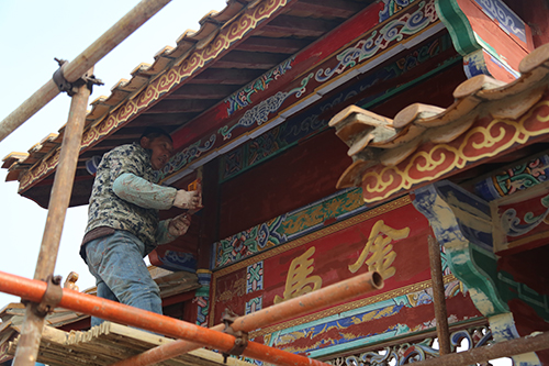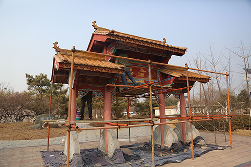 展园内仿古彩绘维修项目主要对原有展园仿古建筑中木作油漆和墙面漆脱落、瓦面破损等部位进行维修,提高建筑观赏性。共需涂刷油漆775平方米、彩画1013平方米、更换瓦面490平方米、涂刷乳胶漆940平方米等,目前已涂刷仿古彩绘油漆约1990平方米。