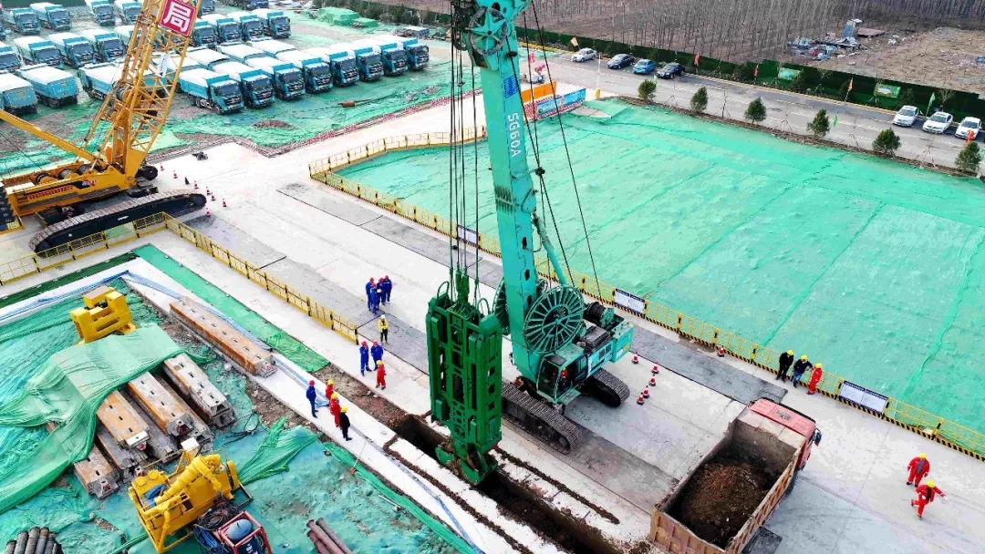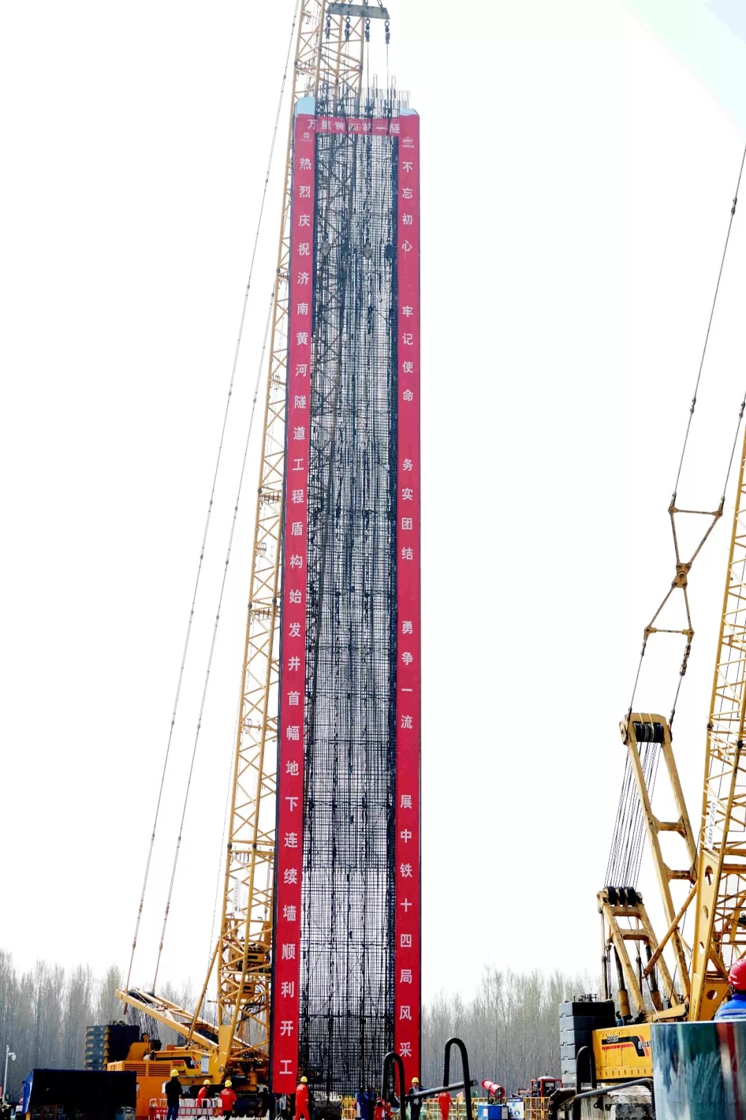 首幅地连墙钢筋笼重达112.7吨,在焊接区完成后,由两台履带吊履带车吊起,整个吊装入槽过程一气呵成。入槽后,随后展开混凝土浇筑,共浇筑混凝土365立方米。北岸始发井共设计77幅同等规模的地连墙,最大埋深51.5米。