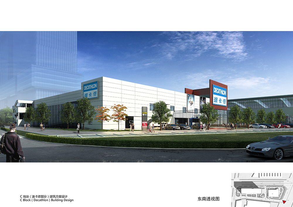 迪卡侬项目总计四层,地上共2层,地上建筑面积约9575平方米,首层使用功能为购物停车,二层功能为超市卖场及办公附属用房。地下共2层,为钢筋混凝土框架结构,主要功能为停车,停车方式是单层停车。停车场总共有三万多平方米,预计拥有车位1300个,为顾客解决了停车问题。