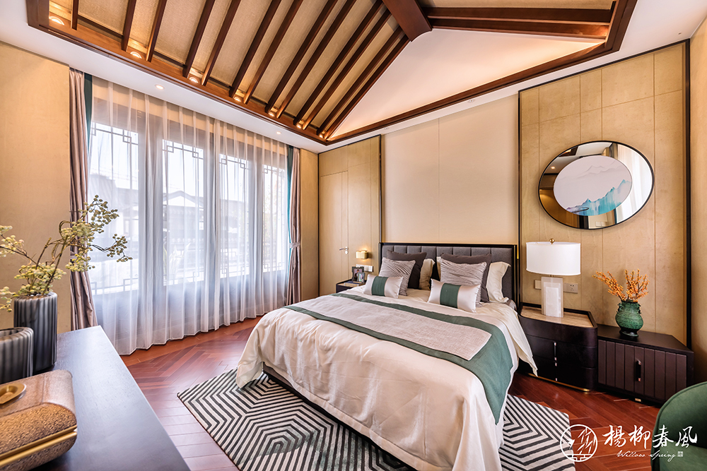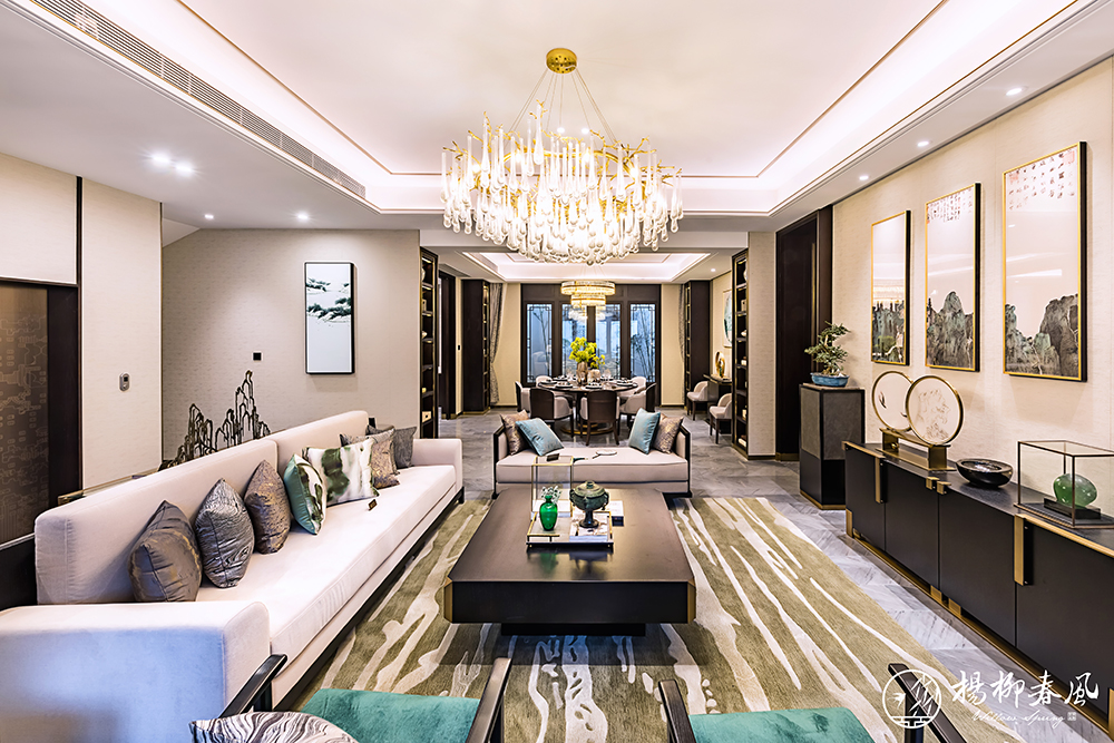 另一套大户型样板房采用新中式风格,以儒家思想为依托,通过大理石、金属铜、木材的有机结合,体现主人的稳重、尊贵和优雅。约110㎡的大面积庭院,演绎着四季不落幕的锦绣风光;挑高约5.7米的地下空间,让格调生活随心定制。整套样板房抒写着文雅灵动的东方气韵,展现了“中正和雅”的国风意境。