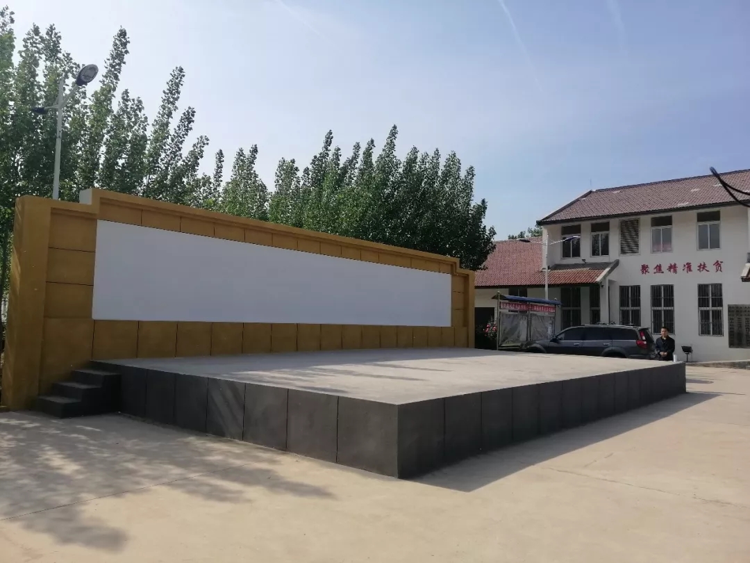 村委会办公楼前,新建成的乡村大舞台即将投入使用。除了脱贫致富提升村民物质生活水平,张庆红还积极协调各种资源,不断努力提升村民精神文化生活水平。近年来,村里通过墙绘、宣传板等宣传孝道,评比“文明家庭”“好婆婆”“好媳妇”等,并成立红白理事会,倡导文明、节俭新风。同时,在集团和各相关单位大力支持下,先后开展“一元爱”、“金晖助老”、公益岗、留守儿童支教、扶贫公益晚会、送戏下乡等系列活动。