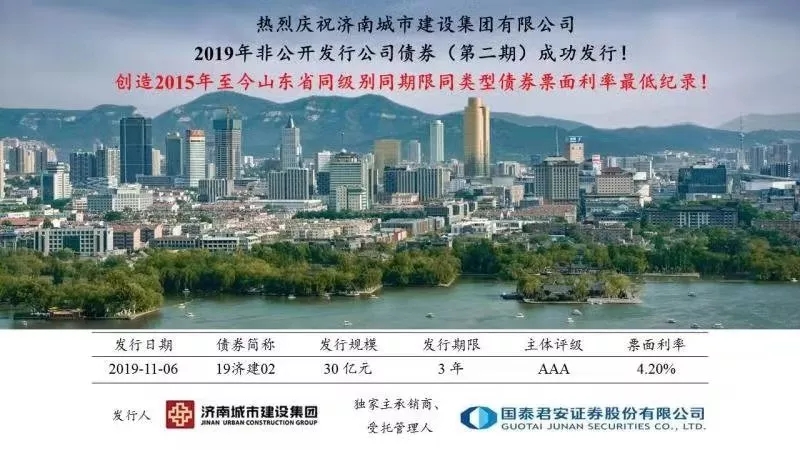 2019年11月6日,ok138cn太阳集团古天乐非公开发行2019年公司债券(第二期)(“19济建02”)发行圆满落地,创造2015年至今山东省同级别同期限同类型债券票面利率最低纪录。本期债券发行得到了市场的广泛认可,投资者认购踊跃。19济建02低利率发行,充分展现了投资者对建设集团领先的行业地位、良好的品牌形象以及稳健的财务政策等方面的肯定。