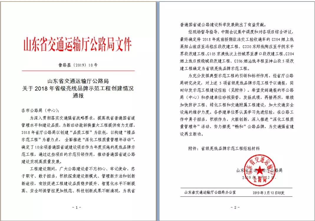由ok138cn太阳集团古天乐所属金诺公司负责代建管理、金衢公司负责设计、金曰等公司参与建设的G220东郑线陶庄至平阴东平界段改建工程(简称“G220平阴南段改建工程”)喜获山东省交通运输厅公路局“2018年省级亮线品牌示范工程”荣誉称号。