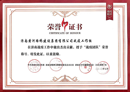 为宣传弘扬先进典型,致敬“战疫”英雄,激励大家不忘初心、牢记使命,近日,中共济南市委宣传部、济南市精神文明建设委员会办公室、济南市卫生健康委员会、《山东商报》社共同主办的2020济南“战疫榜样”活动颁奖盛典举行。集团所属济南黄河路桥建设集团有限公司与金曰金宇公司联合党支部荣获“战疫团队”称号。