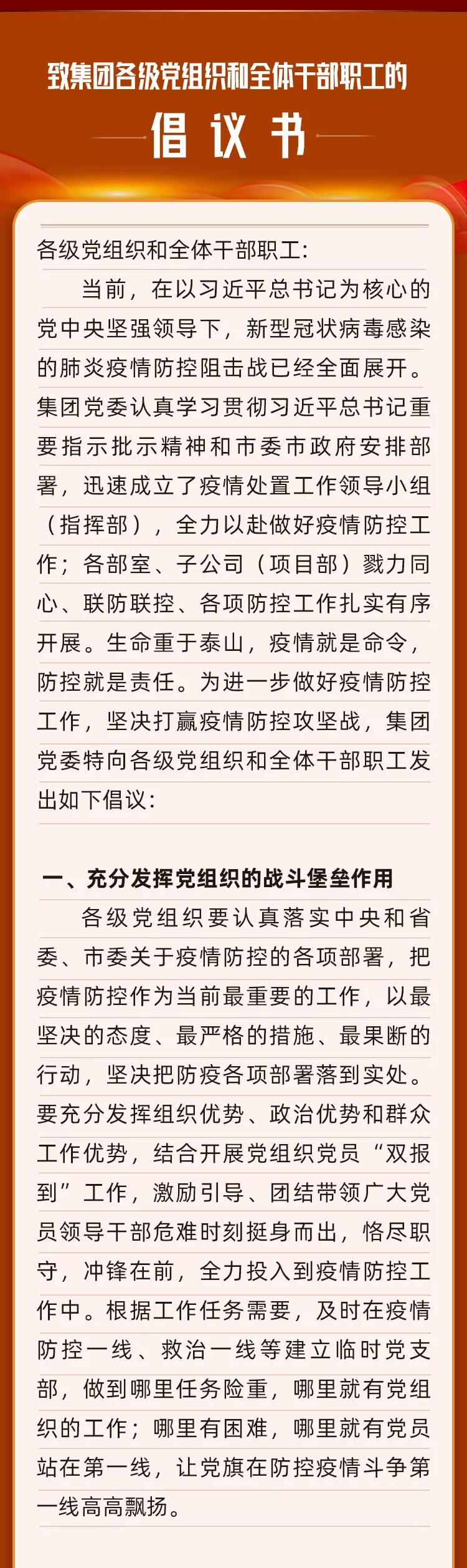致集团各级党组织和全体干部职工的倡议书