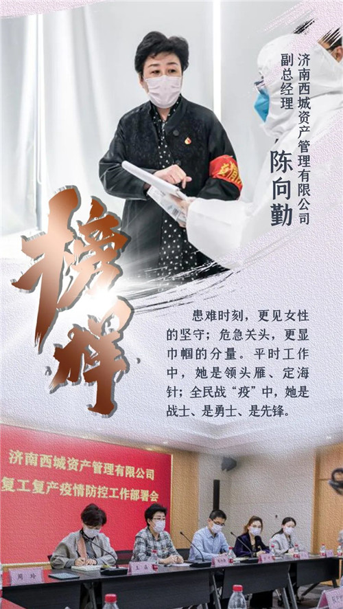 目前,济南全面复工复产,陈向勤对疫情防控工作进行再部署、再强调、再落实,做到“十个一律”、“十个严禁”。她提前出手、摸底调查,切实坚守联防联控严密防线,帮助运营单位制定应对措施,关键时刻施以援手,保障复工复产后资产管理公司所辖写字楼、商业综合体的疫情防控工作万无一失。