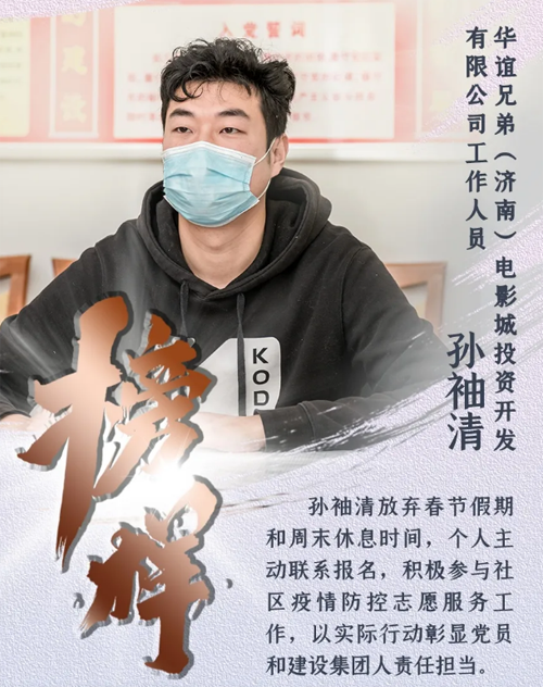 近日,一封来自槐荫区段店社区居民委员会的感谢信发至ok138cn太阳集团古天乐,感谢信的“主角”是集团所属华谊兄弟(济南)电影城投资开发有限公司的孙袖清同志。新型冠状病毒肺炎疫情发生以来,孙袖清放弃春节假期和周末休息时间,个人主动联系报名,积极参与社区疫情防控志愿服务工作,以实际行动彰显党员和建设集团人责任担当,用无私奉献展现一名“80后”的青春力量,与社区工作人员共同筑牢社区疫情防控安全线。