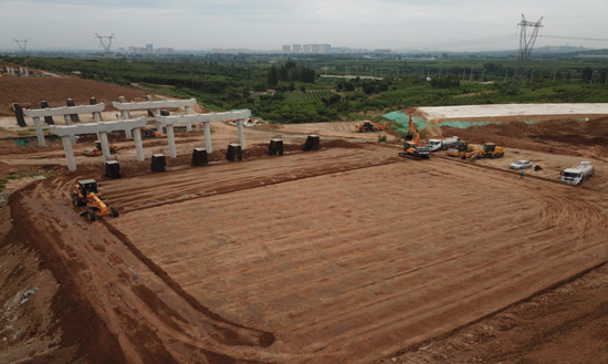 大东环二标段路基总挖方223.77万方,总填方309.7万方。为了确保项目建设的顺利进行,项目部及早安排部署,从2018年底正式开展路基施工,从测量放样、原地面清表、挖土方、填土方等各个环节都做到有条不紊、有序推进,积极利用有利天气,挖掘机、推土机、压路机等来回穿梭轰鸣,并进行积极协调,确保各个工作面都有机械运转,大大提高了施工速度,同时进行细节把控,路基边部采用液压夯补强、搭接部位铺设土工格栅、软土地基采取掺灰处理等,推进进度同时保证了工程质量。10月7日完成全部路基施工任务。