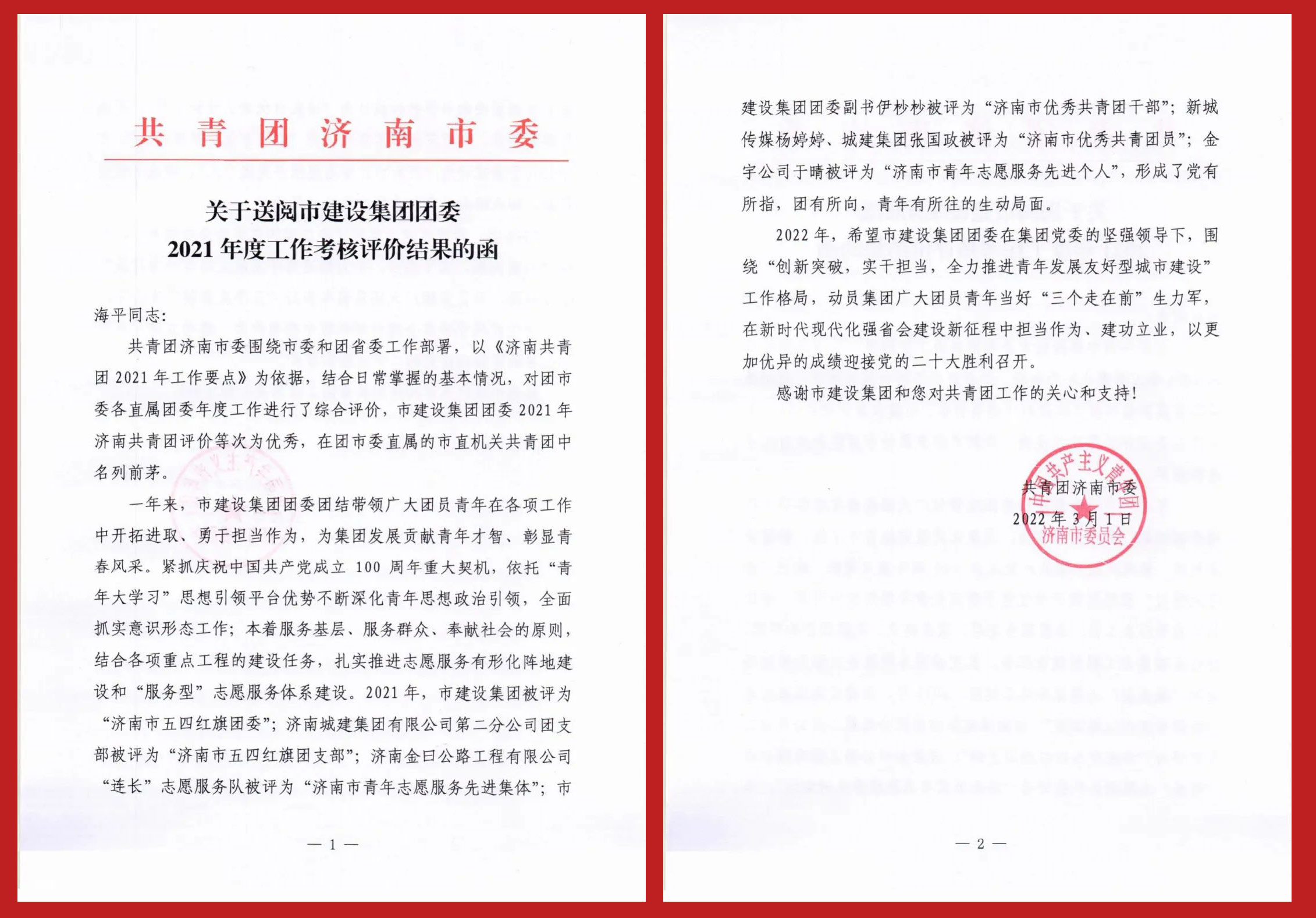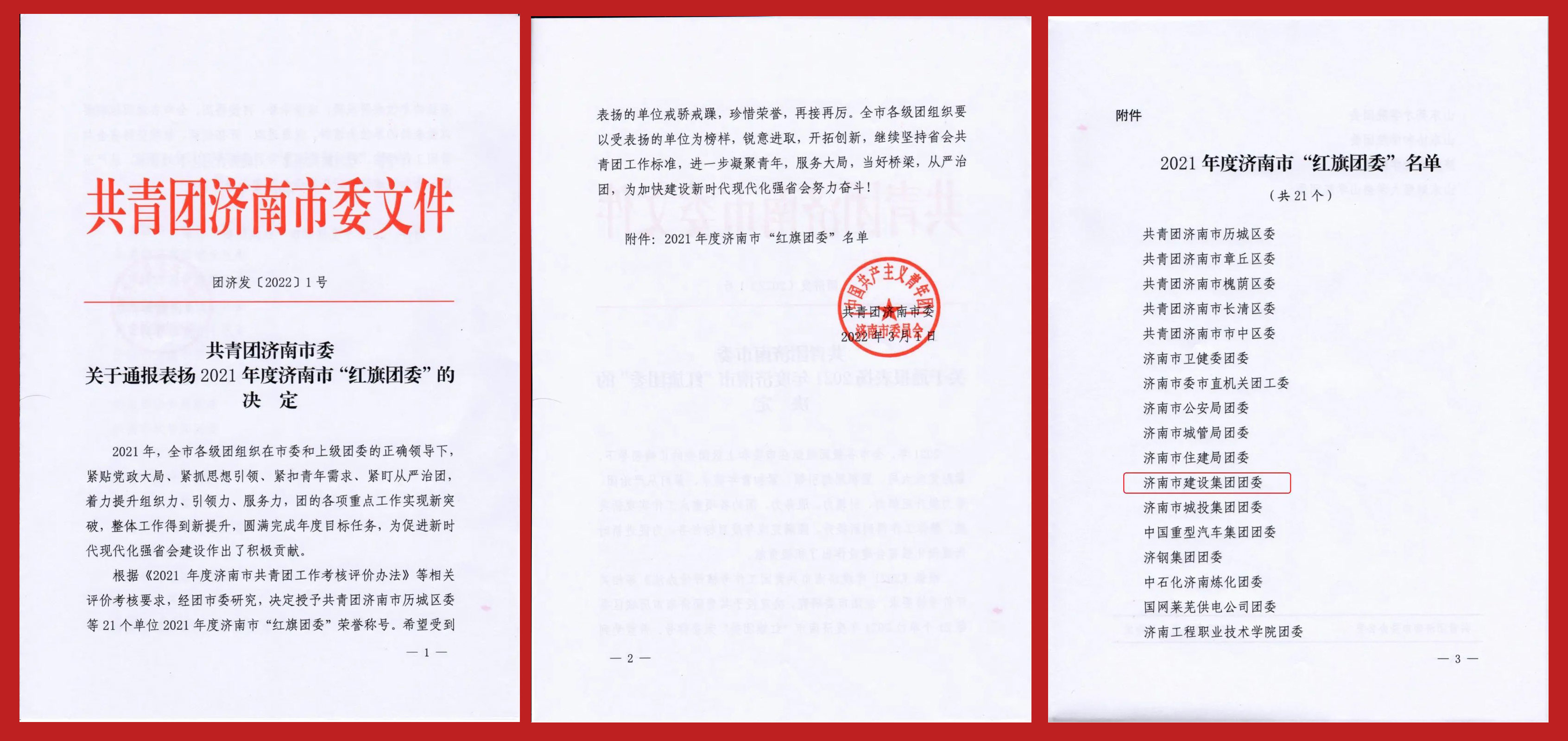 2022年3月1日,共青团济南市十七届四次全委(扩大)会议召开。会议通报了2021年度全市共青团工作综合考核情况,建设集团团委被评为2021年度济南市“红旗团委”。共青团济南市委向集团主要领导发来了《2021年建设集团团工作考核评价函》,并向集团对共青团工作的支持和关心表示了感谢。
