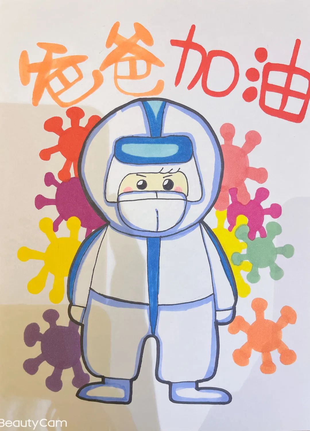 “爸爸加油”!这幅可爱的”大白”卡通画,出自建设集团所属济南城建集团公司下沉南苑社区服务中心的志愿者杜谦12岁女儿之手。一身洁白的防护服,戴着厚实的口罩,只露出一双炯炯有神目光坚定的大眼睛,这是女儿心中爸爸最帅的形象。