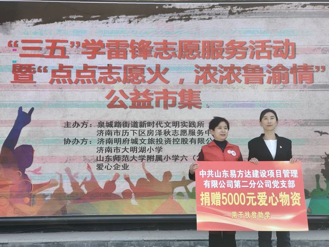 为进一步学习和弘扬雷锋精神,大力发扬“奉献、友爱、互助、进步”的志愿精神,积极响应拓展东西部协作工作领域,促进东西部协作,共建鲁渝情。3月5日,易方达公司所属党支部作为爱心企业代表,参与了济南市历下区房泽秋志愿服务中心主办的“点点志愿火,浓浓鲁渝情”公益市集活动。