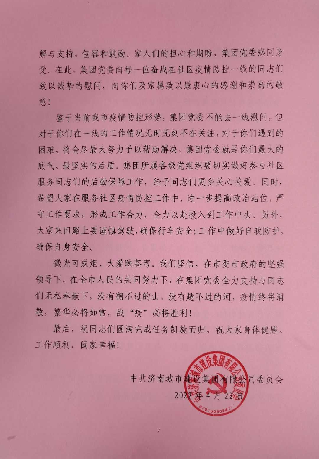 鉴于当前我市疫情防控形势,集团党委不能去一线慰问,但对于你们在一线的工作情况无时无刻不在关注,对于你们遇到的困难,将会尽最大努力予以帮助解决,集团党委就是你们最大的底气、最坚实的后盾。集团所属各级党组织要切实做好参与社区服务同志们的后勤保障工作,给予同志们更多关心关爱。同时,希望大家在服务社区疫情防控工作中,进一步提高政治站位,严守工作要求,形成工作合力,全力以赴投入到工作中去。另外,大家来回路上要谨慎驾驶,确保行车安全;工作中做好自我防护,确保自身安全。
