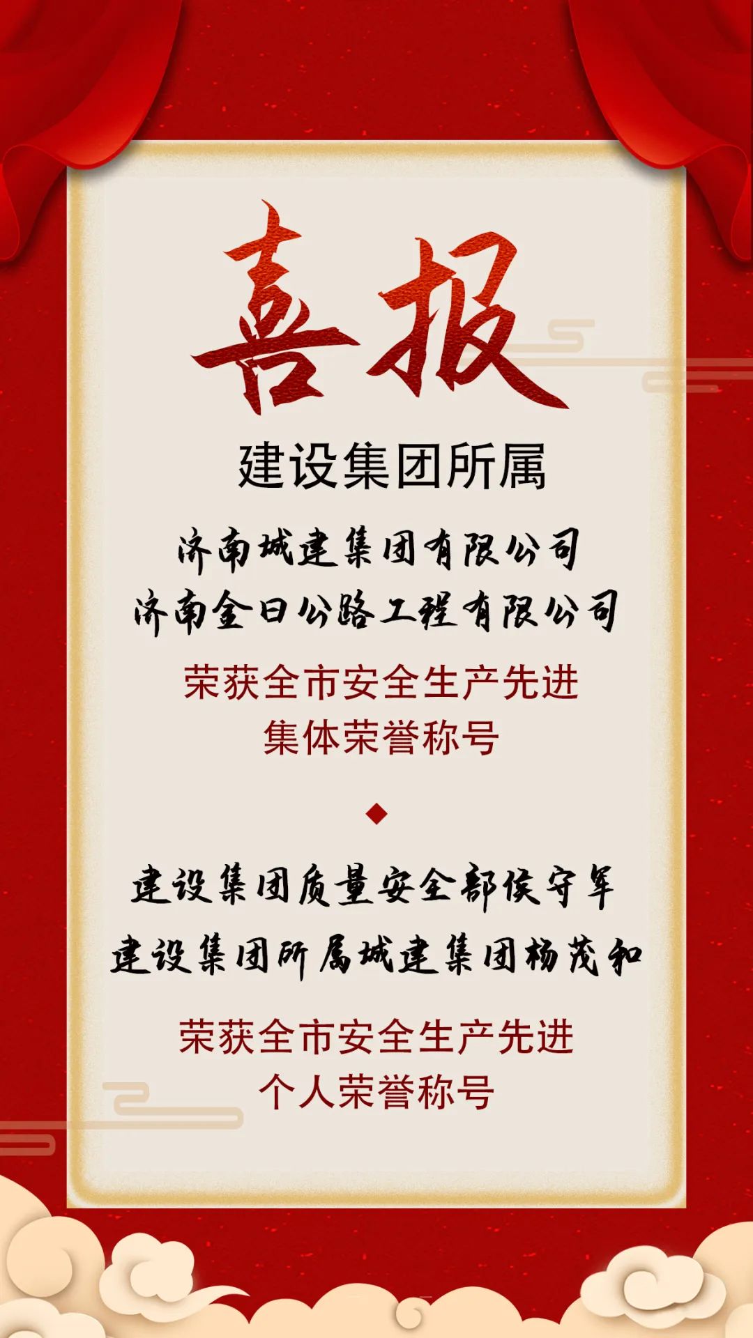 近日,济南市安全生产委员会发布《关于表扬全市安全生产先进集体和先进个人的通报》,建设集团所属济南城建集团有限公司和济南金曰公路工程有限公司荣获全市安全生产先进集体荣誉称号,建设集团质量安全部侯守军,建设集团所属济南城建集团有限公司杨茂和荣获全市安全生产先进个人荣誉称号。