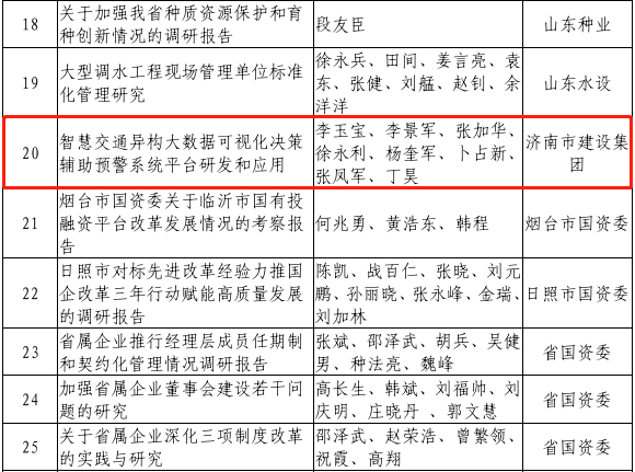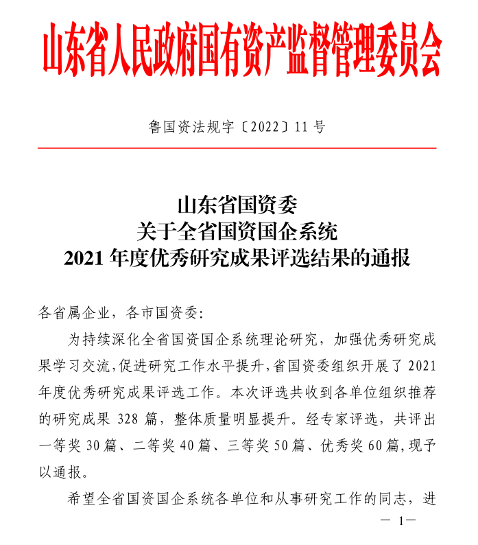 近日,山东省国资委发布了《山东省国资委关于全省国资国企系统2021年度优秀研究成果评选结果的通报》(鲁国资法规字〔2022〕11号)文件,ok138cn太阳集团古天乐总工办牵头,集团所属山东金宇信息集团有限公司研究的《智慧交通异构大数据可视化决策辅助预警系统平台研发与应用》成果荣获“全省国资国企系统2021年度优秀研究成果”一等奖。