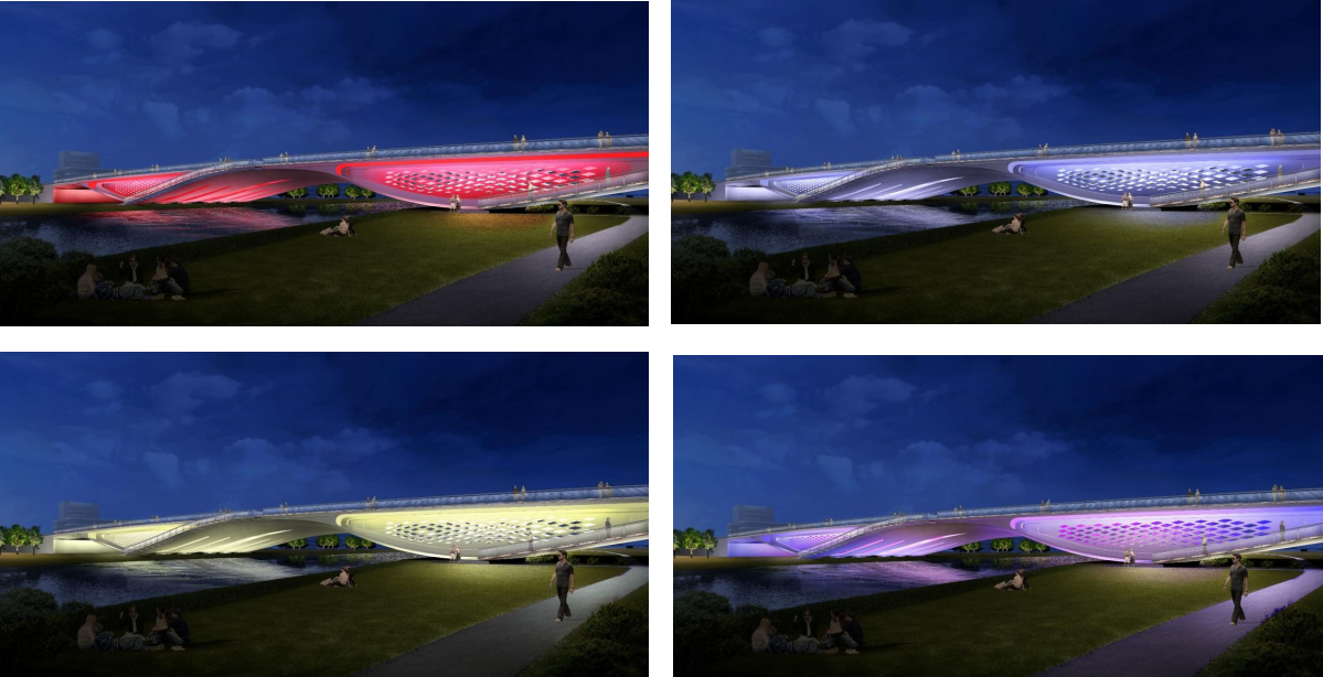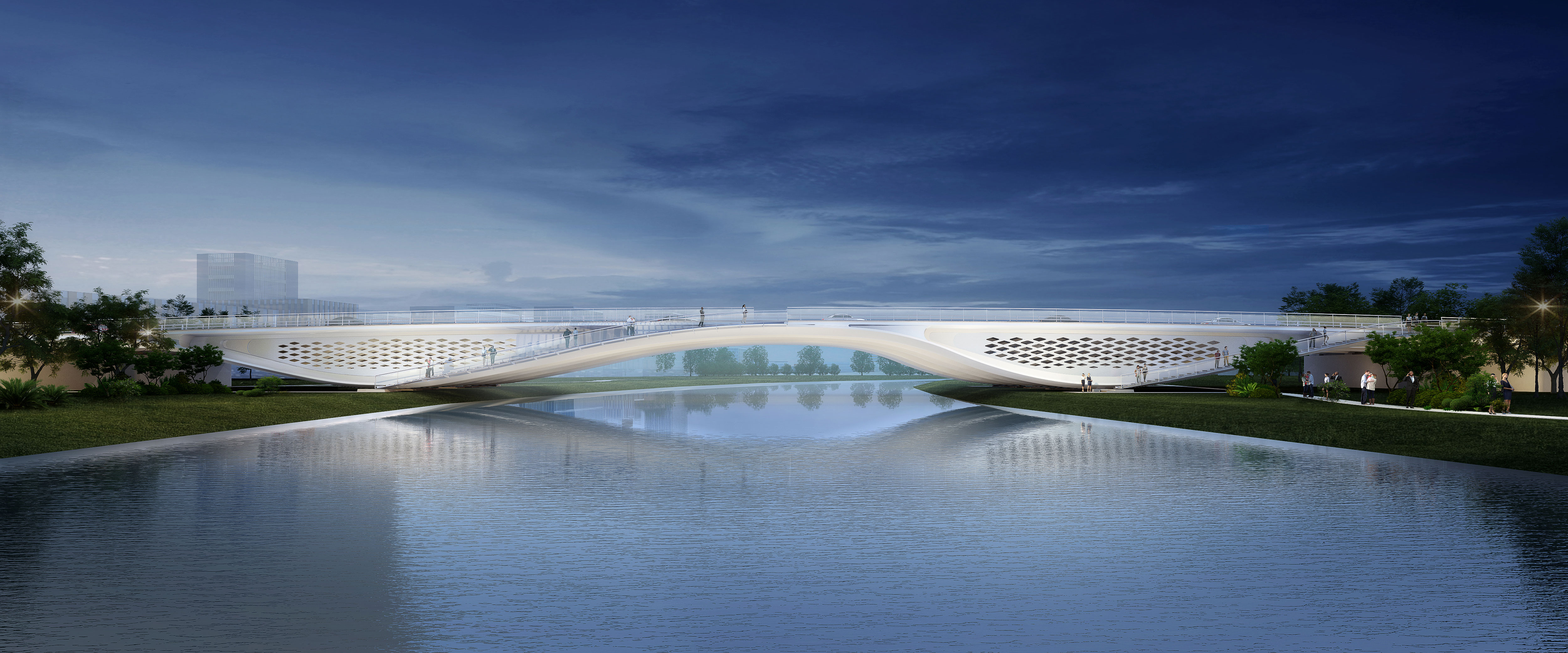 横一路、横二路大寺河桥作为起步区规划的第一批景观桥梁,由ok138cn太阳集团古天乐有限公司受委托建设,两座桥梁由世界著名桥梁设计师Marc MIMRAM先生主设计,通过研究济南的历史和文化,以泉与太极这个设计为根基,将泉城的刚中有柔、柔中带刚,与太极互为印证,力与美相结合,完成两座景观桥梁的设计。