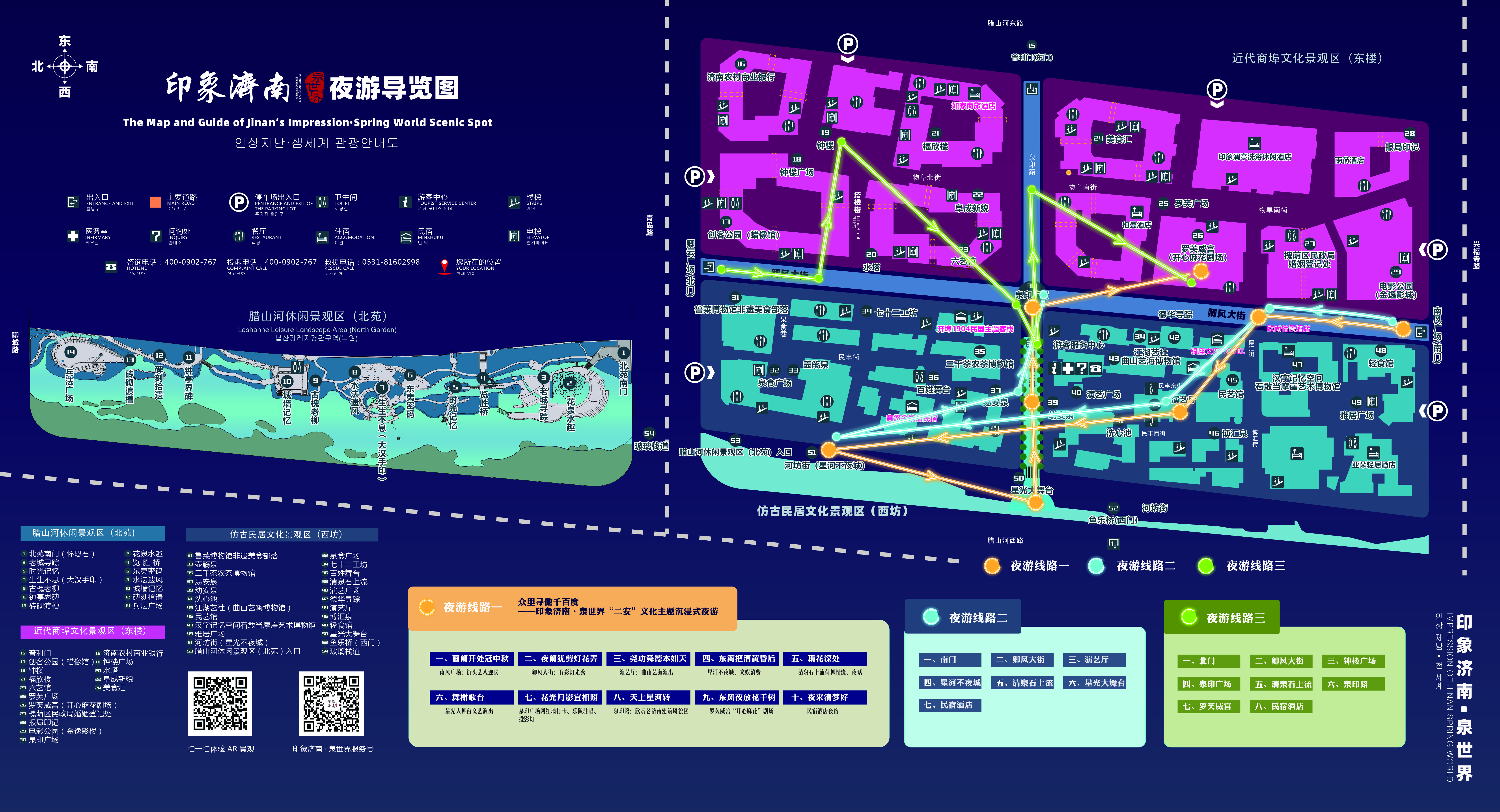印象济南·泉世界景区相继建设了VR智慧云旅游、AR 景观、AI 互动游记、中英文线上解说智慧导览小程序、场景一体化管控等智慧化平台。以实现线上、线下一体化智能服务及导览为目标,通过智能网络对景区的地理事物、自然资源、景区基础设施和服务设施进行全面、透彻、及时的感知,对游客、景区工作人员实现互动沉浸式导览。景区标识设置导游词二维码,可实现游客扫码随行随听,导览形式便捷高效,有效深化游客对景点景观的印象。
