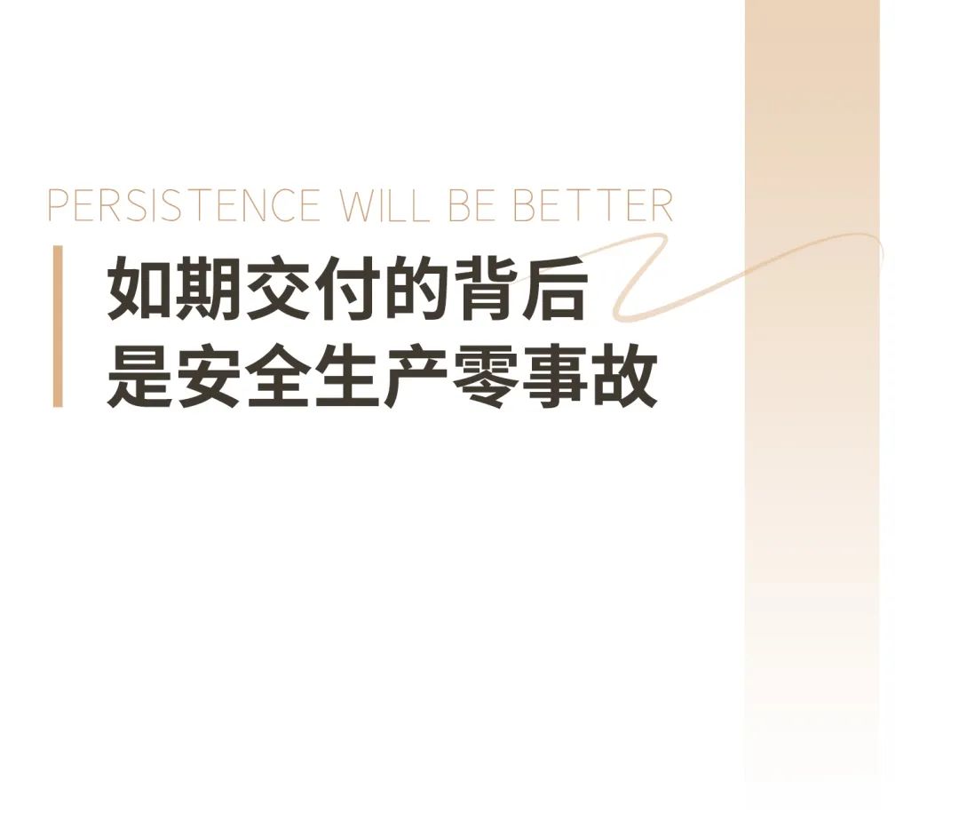 每个项目都要历经上千个日夜的建设和精心打磨,始终秉持“安全第一,以人为本”的原则,充分发挥统筹组织和现场指挥能力,以安全生产为首要任务,整个建设周期达成安全生产零事故,为项目施工人员创造安全、健康的工作环境,维护现场人员的安全健康权益。通过严格的安全生产,确保产品品质,为业主建设安全、舒适、放心的家园。