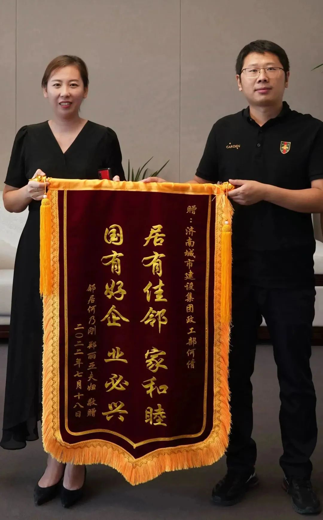 一面“居有佳邻家和睦 国有好企业必兴”的锦旗送至建设集团,这是济南市民何先生对何倩给予其妻子的及时帮助所表示的诚挚感谢。