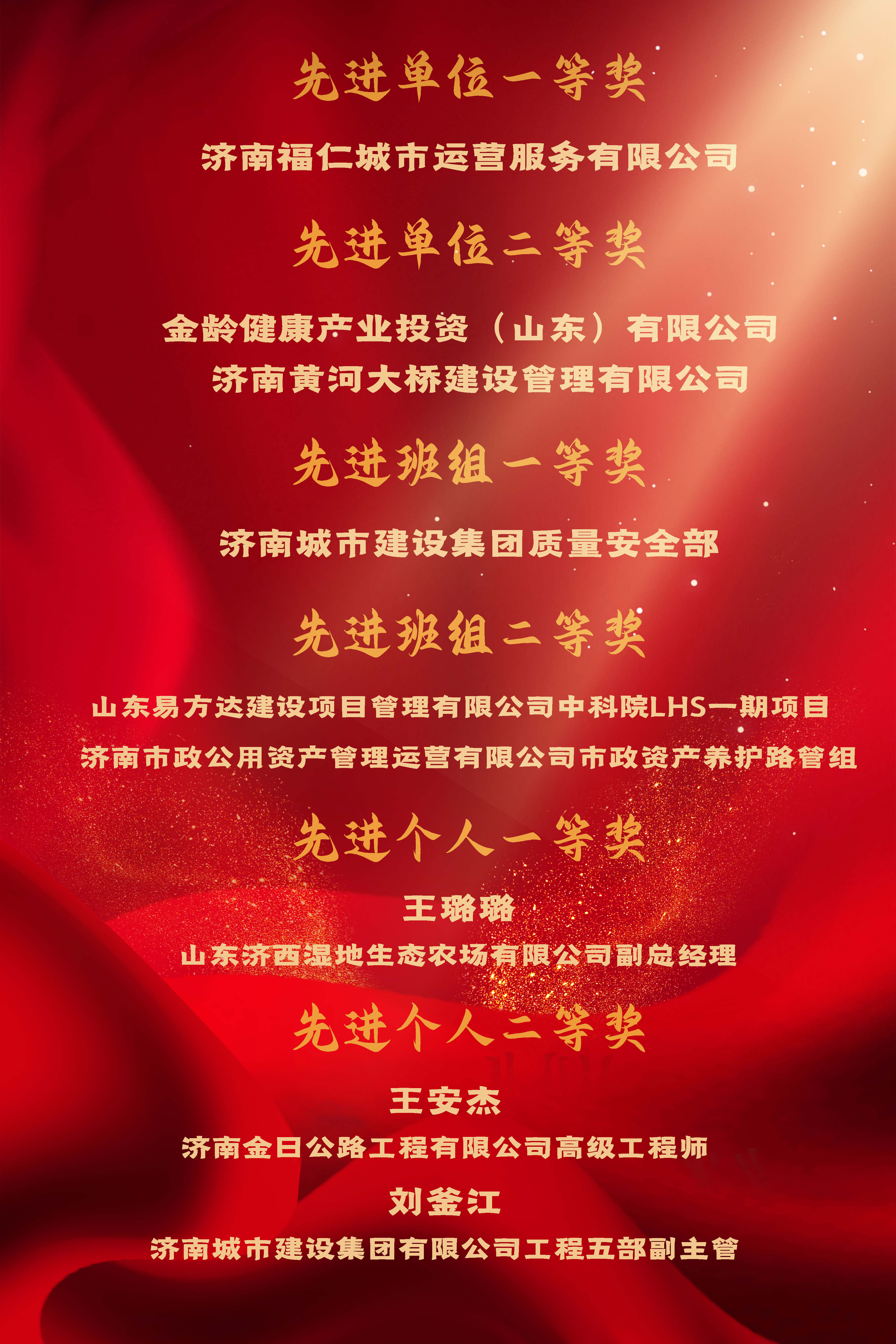 会上宣读了《关于表扬2022年建设强省会劳动竞赛先进集体和先进个人的通报》,获得劳动竞赛一等奖的30个单位获颁济南市五一劳动奖状、30个班组获颁济南市工人先锋号、80名职工获颁济南市五一劳动奖章。其中,建设集团3家公司获先进单位称号,3个班组获先进班组称号,3名同志获先进个人称号。