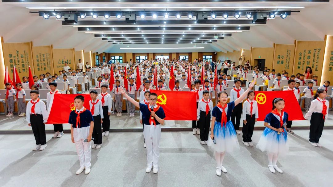 活动现场,与会嘉宾们为新入队的少先队员们佩戴了红领巾,为新建中队授中队旗,见证了党、团、队三旗传递,徐冬梅为孩子们送上了“六一”寄语,建设集团为孩子们赠送了入队成长礼物。