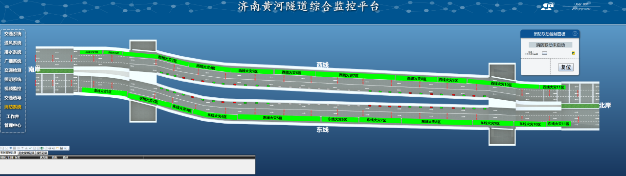 在济南黄河济泺路隧道中,交通系统的主要设备包括72个道路指示灯、7块情报板和12组车感线圈,设备的应用可以有效地诱导车辆按照规定的路线和速度行驶,保证交通流畅和安全,进一步提高交通运营效率;