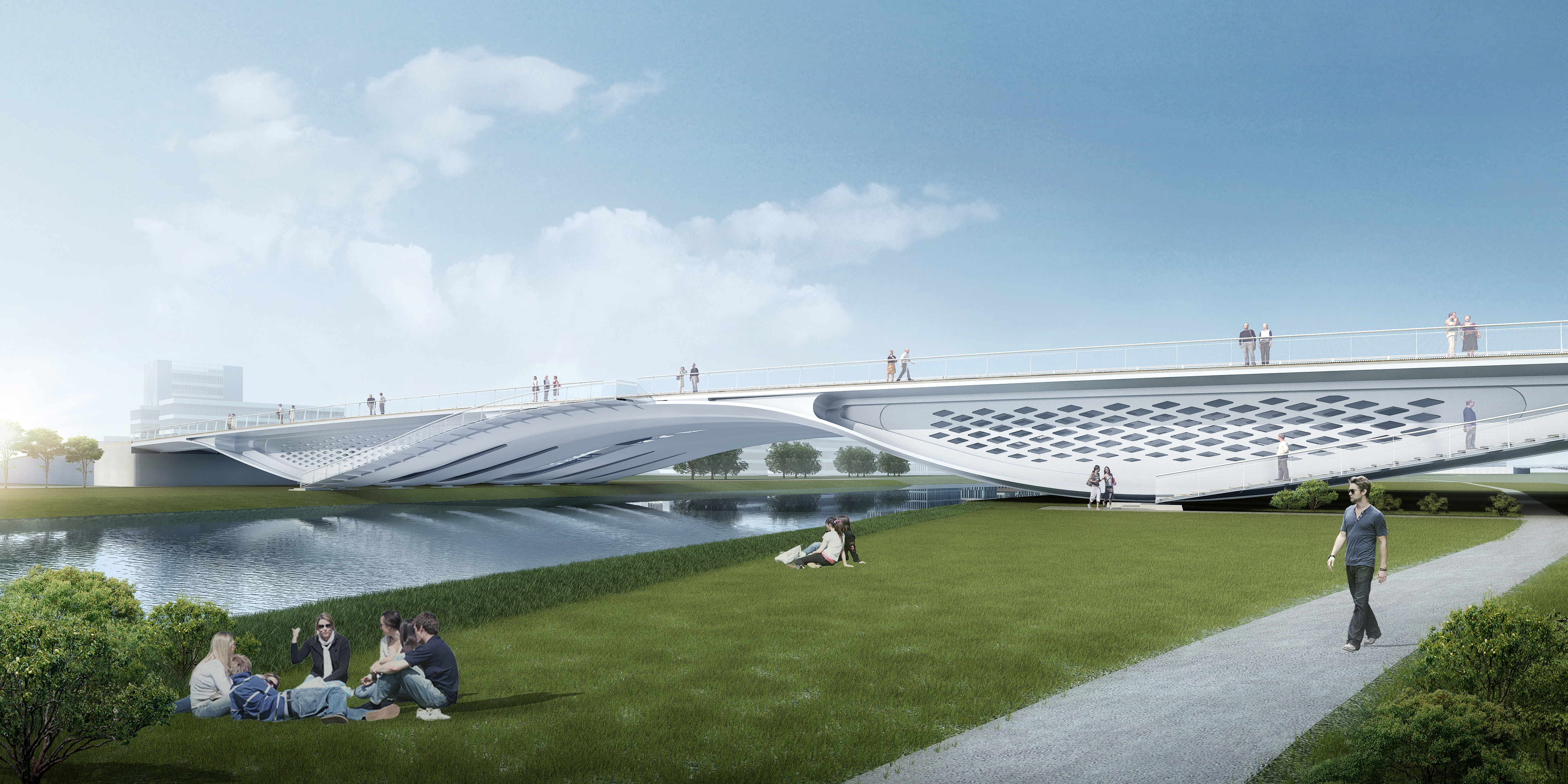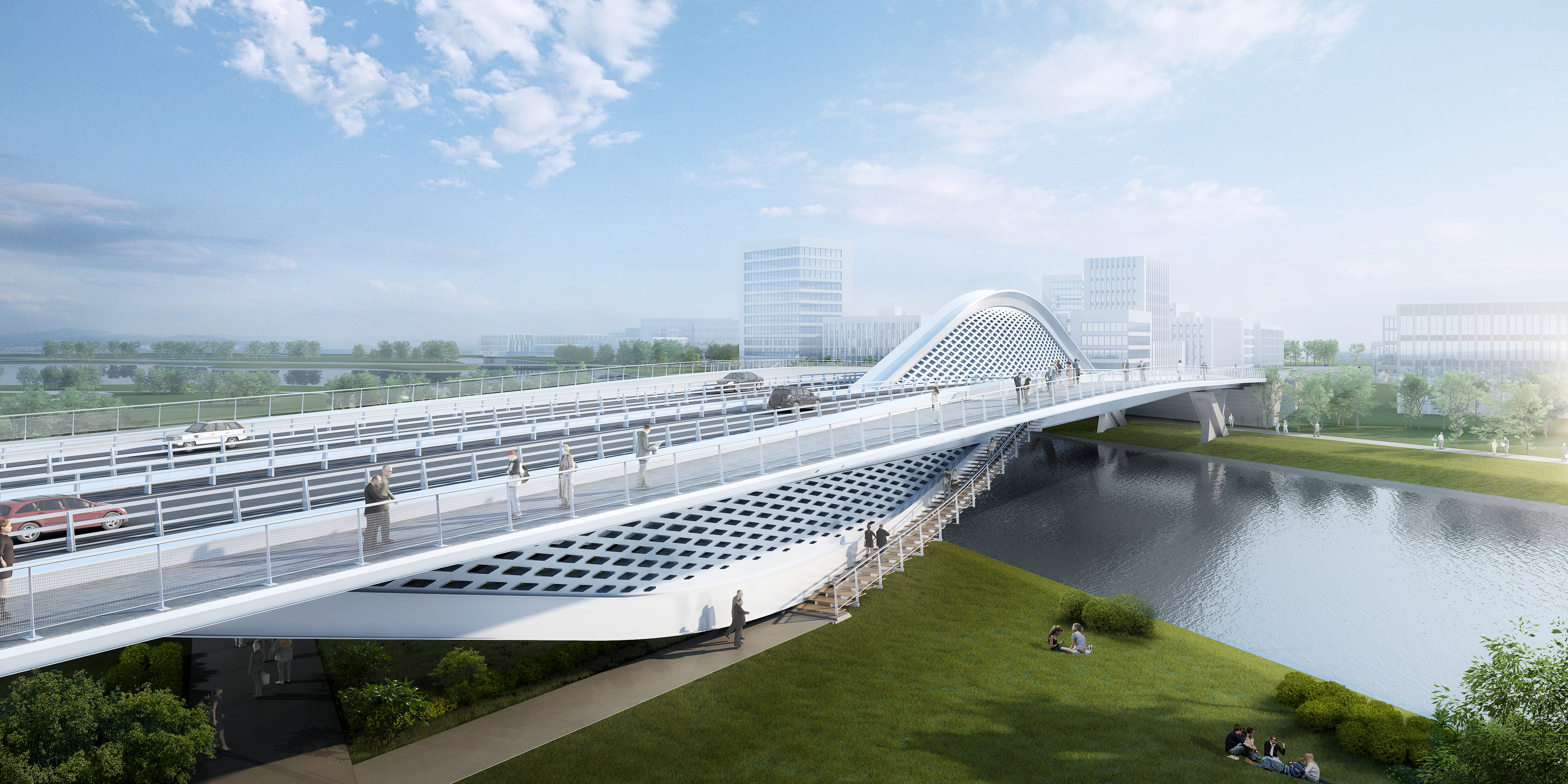 横一路大寺河桥由世界著名桥梁设计师Marc MIMRAM先生主设计,由建设集团所属济南金曰公路工程有限公司承建。桥梁全长168.1m,采用三跨梁拱组合钢结构,一跨(93.5m)跨越大寺河主河道,桥梁桥面总宽35.9~42.6m,桥梁钢结构总钢材用量4300余吨。