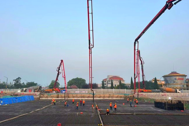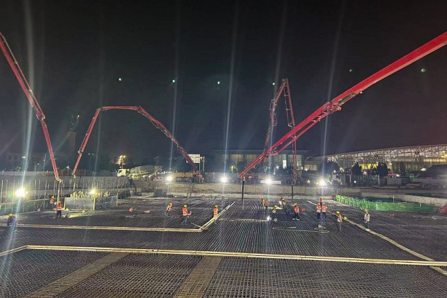 本次浇筑从9月6日22时开始,历时30小时,4台泵车联合作战,顺利浇筑完成3800立方米混凝土。为完成施工区域道路导改及管线迁改,临八路人防顶板先行施工,人防盖板由钢管柱支撑,长度49米,宽度73.5米,盖板下主体结构及土方施工采用盖挖法施工,结构主体采用C45P8抗渗混凝土。
