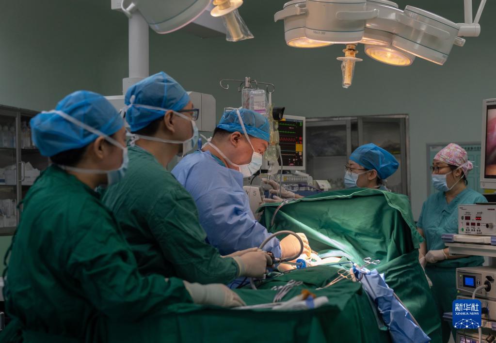 在北京市第六医院的医联体胸外科病房手术室,北京协和医院与北京市第六医院的医护人员进行团队协作开展胸腔镜手术(2021年6月3日摄)。新华社记者 才扬 摄