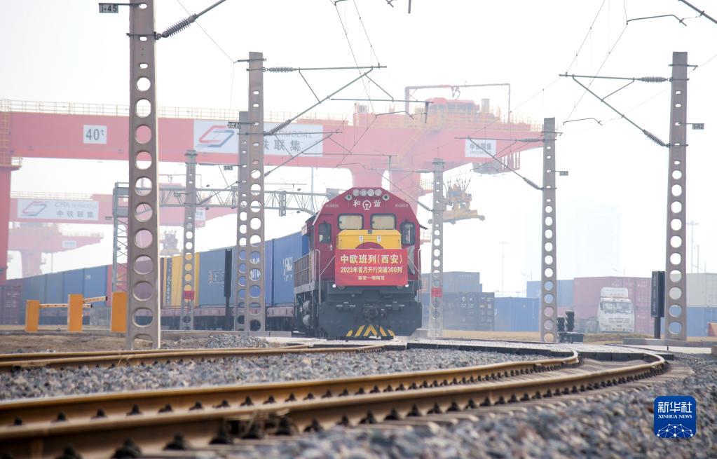 满载日用百货的X8151次中欧班列从西安国际港站驶出,开往白俄罗斯首都明斯克(2023年2月1日摄)。新华社记者 李一博 摄