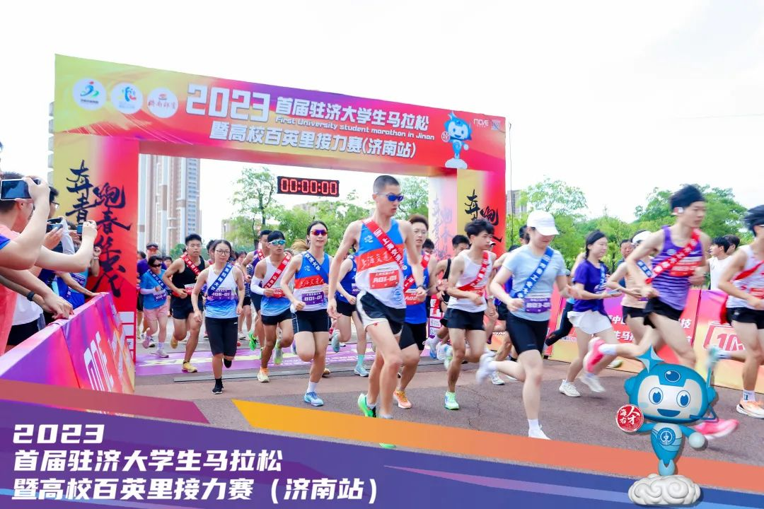 随着发令枪响,参赛选手们分成东西两队踏上人字形主题跑道,进行了“人字形主题热身跑”。大约500米后,选手们抵达天圆广场集结区,首届驻济大学生马拉松迷你项目和高校百英里接力赛全马接力项目激烈开赛。