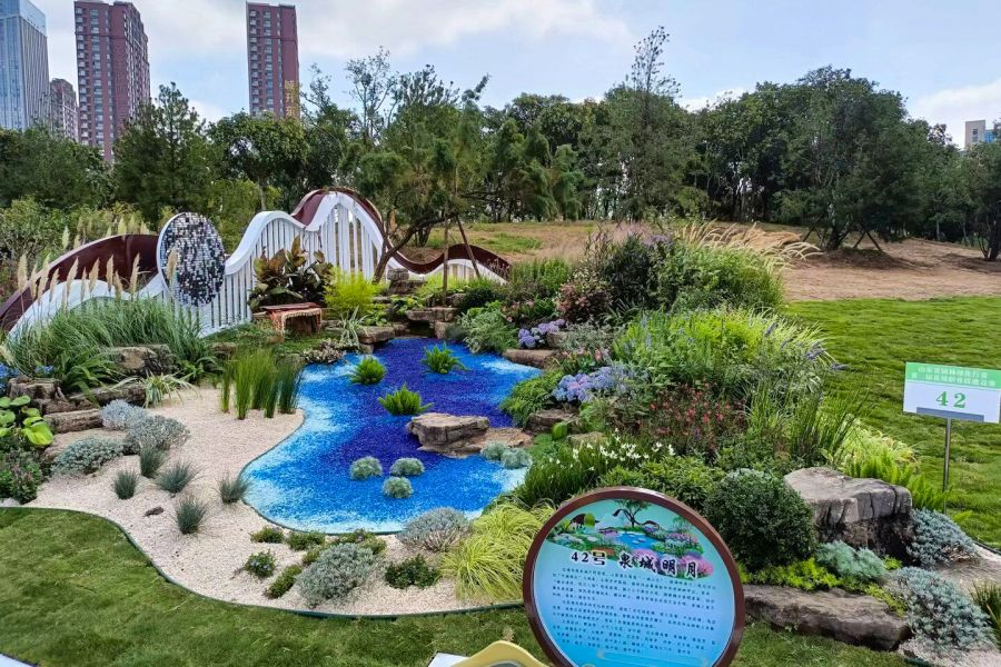 自接到参赛任务后,城建集团公司高度重视,精心组织,选派业务技能扎实的专业技术人员参赛,将此次竞赛作为展示集团形象的重要平台。比赛过程中,参赛队员积极克服天气、选材、地形高差、异地施工等困难,在地形塑造、景观施工、苗木栽植等环节中精益求精,以“泉城明月”作为参赛主题,融入节约环保、生态自然的理念,创新使用深蓝、浅蓝、白色三色琉璃石子渐变仿真水景,与花序、山景共同打造“一城山色半城湖”,再现“泉城月明”意境。