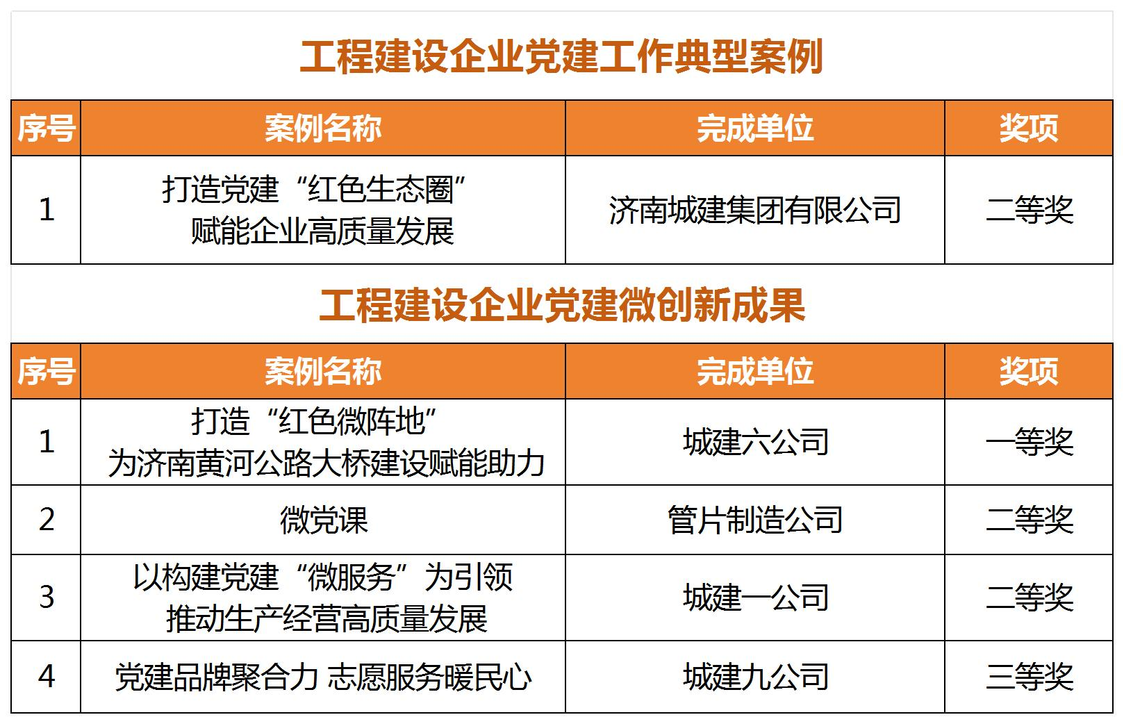 近日,中国施工企业管理协会发布了《关于推广2024年工程建设企业党建工作优秀成果的通知》,建设集团所属济南城建集团公司《打造党建“红色生态圈” 赋能企业高质量发展》党建工作案例获评“工程建设企业党建工作典型案例”二等奖,城建六公司《打造“红色微阵地 ” 为济南黄河公路大桥建设赋能助力》、城建一公司《以构建党建“微服务”为引领 推动生产经营高质量发展》等4项案例分别获评“工程建设企业党建工作微创新成果”一、二、三等奖。
