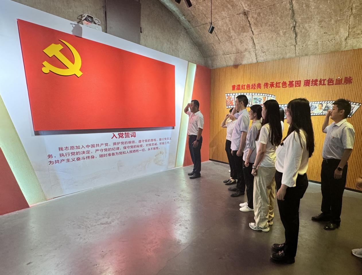 在红色文化教育和国防知识普及长廊,大家学习了党的一大到二十大的百年奋斗历程,了解了泉城人民防空建设历史。随后,大家庄严宣誓,重温入党誓词。