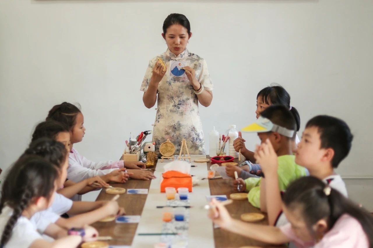 老师带领小朋友现场体验掐丝珐琅和水拓团扇非遗技艺。孩子们认真地完成掐丝、点蓝等步骤,用颜料勾勒出美丽的图案,不仅体验了手工制作的乐趣,也对非遗技艺有了更直观的认识。