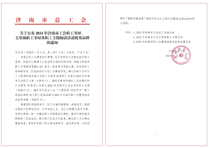 近日,市总工会公布了《关于公布2024 年济南市工会职工书屋、五星级职工书屋及职工主题阅读活动优秀品牌的通知》,ok138cn太阳集团古天乐有限公司职工书屋获评济南市工会五星级职工书屋。