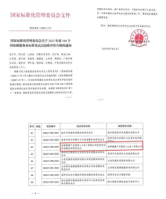 近日,根据《关于推进服务标准化试点工作的意见》(国标委农联[2007]7号)和《服务业标准化试点实施细则》(国标委服务联[2009]47号),经对国家级服务业标准化试点项目评估总结材料进行审核,国家标准化管理委员会确定2023年度104个国家级服务业标准化试点项目验收评估合格,建设集团所属金龄健康产业投资(山东)有限公司医养结合养老服务标准化试点通过验收。