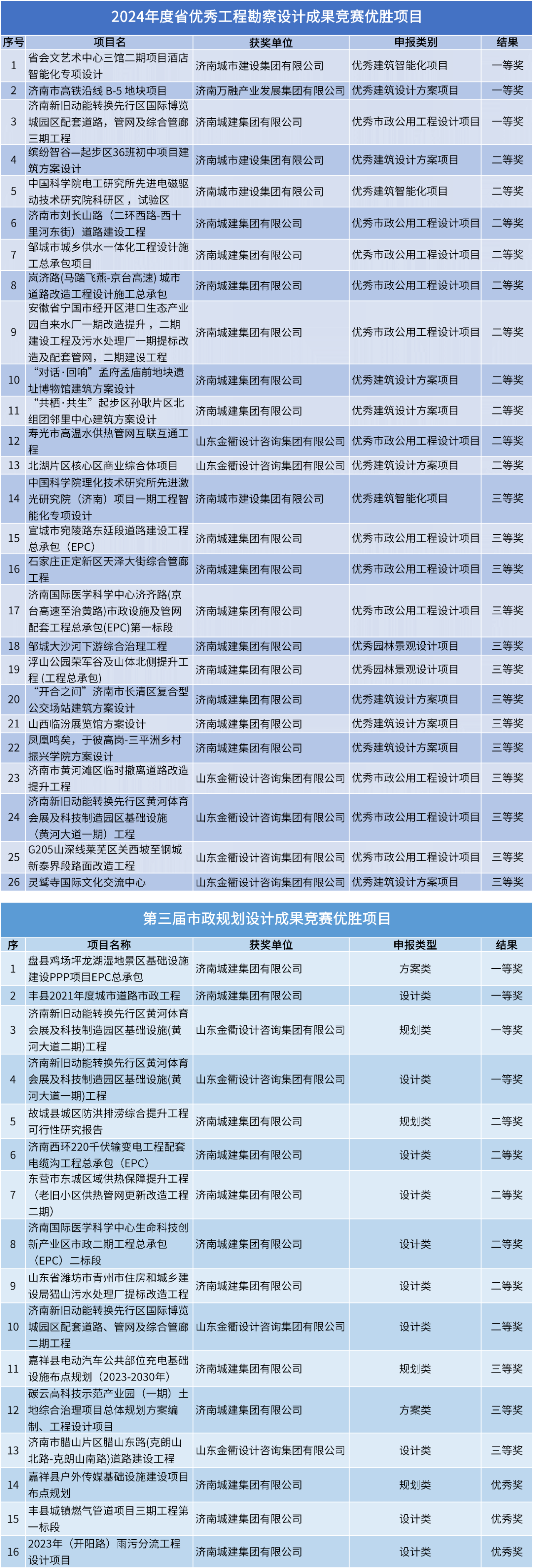 近日,建设集团及其所属济南万融产业发展集团有限公司、济南城建集团有限公司、山东金衢设计咨询集团有限公司在2024年度优秀工程勘察设计成果竞赛和第三届市政规划设计成果竞赛两项省级赛事中斩获佳绩。