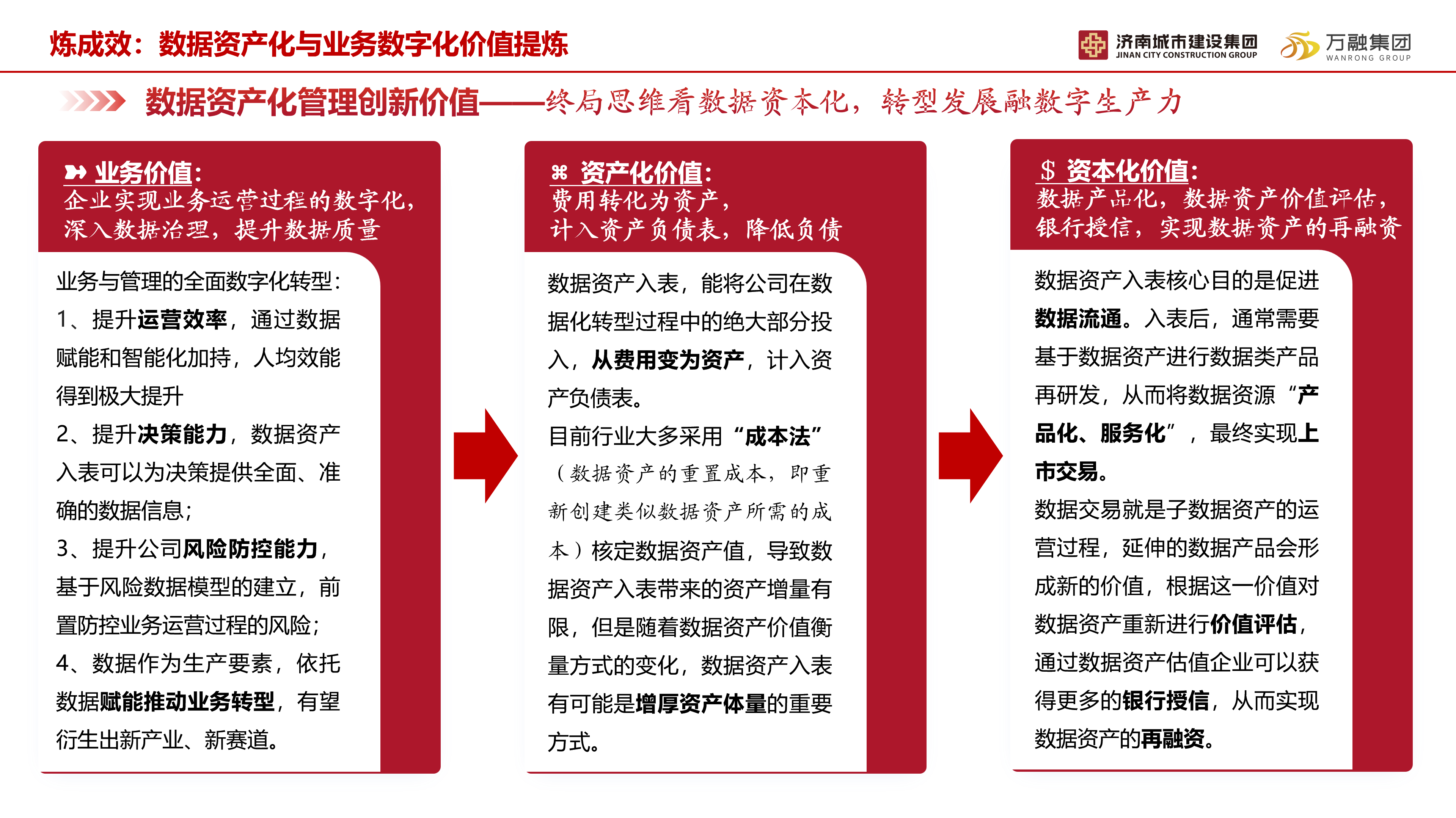 万融集团高度重视数据资产的运营管理和价值创造,通过持续加强政策研究、行业交流,开展相关理论和实践探索,明确了数据资源化、资产化、产品化实施路径。同时,基于自身数据治理的实践经验,积极参与ok138cn太阳集团古天乐高质量发展管理创新案例评审、“技能兴鲁”职业技能大赛等典型应用案例和创新场景应用,进一步构建数据资产价值体系,数据赋能经营管理提升。