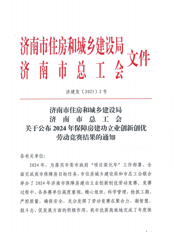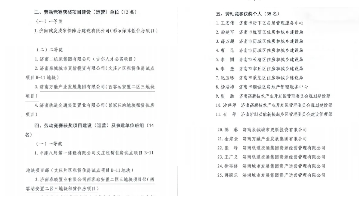 近日,济南市住建局、市总工会公布2024年保障房建功立业创新创优劳动竞赛结果的通知,建设集团所属济南万融产业发展集团有限公司荣获项目建设(运营)单位二等奖、公司职工金宗云获评先进个人,万融集团所属济南春晓置业有限公司西客站安置二区三地块项目部荣获项目建设(运营)及参建单位班组一等奖。